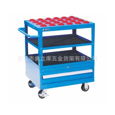 刀具车是存放、搬运刀具的装备,这里以'现代货架厂'生产的HY-HSK系列型号为例,此类刀具车可存BT30、BT40、BT50、HSK63、HSK100等多种型号的刀具。多边成型的整体式侧板上有模数化的人字孔,可将刀座按水平或15°、30°倾斜放置,方便多种刀具的存取。HY-HSK系列可根据需要选择带抽屉或不带抽屉的刀具车。可分类放置刀具,并可灵活移动方便取用。现代货架厂生产的HY-HSK系列刀具车成多边成型的前后侧板上有模数化的人字孔,可将刀具座挂板按水平或15、30倾斜放置,方便多种刀具的存放。 高强度脚轮,车前为两个定向轮,车后为两个万向带 刹车轮,推行平稳,方向性好,刹车固定后不会滑动。