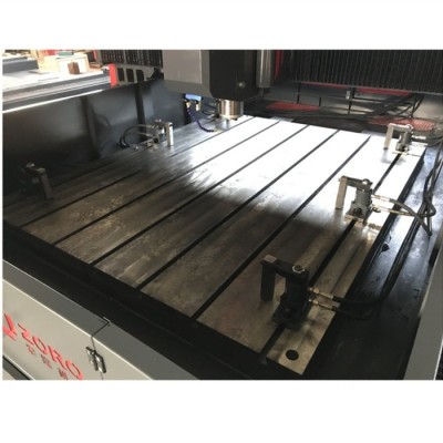 3、床身、立柱,工作台,龙门为HT250铸造结构件,支架为矩形管焊接件,加工前经高温退火,半精加工后二次退火去除应力,然后再精加工,可保证机床精度稳定,床面采整体铸铁工作台精铣出T型槽,台面数控精磨而成,保证工作台面精度。