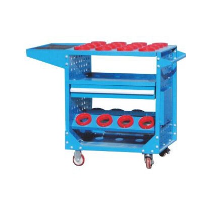 数控铣床车床刀具放置架加工中心刀柄放置架 东莞市美立库五金货架有限公司 联 系 人:舒先生 联系电话:13829278717 刀具车、刀具柜: 刀具车是存放、搬运刀具的装备,这里以‘现代货架厂’生产的HY-HSK系列型号为例,此类刀具车可存BT30、BT40、BT50、HSK63、HSK100等多种型号的刀具。多边成型的整体式侧板上有模数化的人字孔,可将刀座按水平或15°、30°倾斜放置,方便多种刀具的存取。HY-HSK系列可根据需要选择带抽屉或不带抽屉的刀具车。 ,可分类放置刀具,并可灵活移动方便取用。 现代货架厂生产的HY-HSK系列刀具车成多边成型的前后侧板上有模数化的人字孔,可将刀具座挂板按水平或15、30倾斜放置,方便多种刀具的存放。 高强度脚轮,车前为两个定向轮,车后为两个万向带 刹车轮,推行平稳,方向性好,刹车固定后不会滑动。