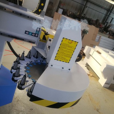 这款设备是一款柜体、门板高效开料机,一个主轴圆盘自动换刀,刻不同花型的门板,一个主轴是5+4数控排钻包做柜体打孔效率高,用的新代高端四合一系统,是可以同时控制六轴联动的高端系统,开机直接工作,不用回机械远点,并有配套1.1KW伺服电机及驱动器,系统信息到达工作终端,信号无损失,精度很高**八小时开板70-80张,效率也是很高的。