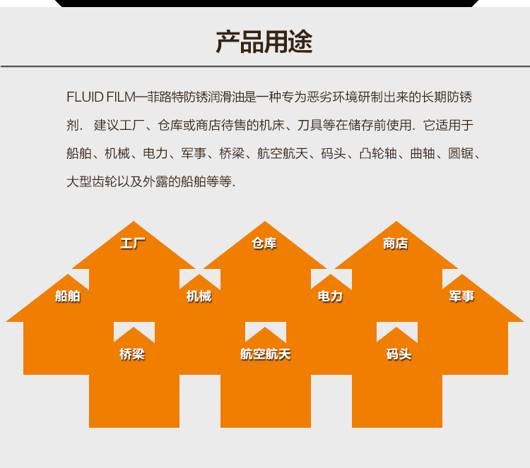 从开发至今,几十年来FLUID FILM-菲路特防腐润滑油一直应用于美国海军、陆军、空军、美宇宙航空局等****的装备中,除运用在军事领域外,并且因其独特的环保 、防腐、润滑的特征,在世界船舶、海洋勘探建设领域中的应用也与日俱增。另外在采矿设备、机械设备、码头设施、各种舰船、造船厂 、航空航天领域、大型桥梁、海底隧道、机动车辆、模具设备、皮革制品、家庭五金等领域也得到广泛应用。