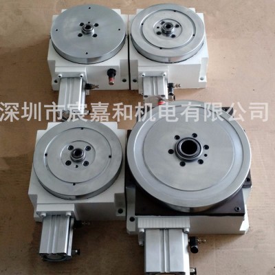 气动分度盘 一、利用气压(油压)作间歇回转运动,整体构造坚固准确度高; 二、适用生产量大之工件,做等份多站之加工或送料; 三、反应快可兴攻牙机、钻床、铆钉机、小型冲床、超音波、烫金机或其他工作机配合使用; 四、其工作站调整简单,标准分度4、6、8、12、24站; 五、附有缓冲装置可减少其冲击; 六、惯性太大时须考虑降低分割速度